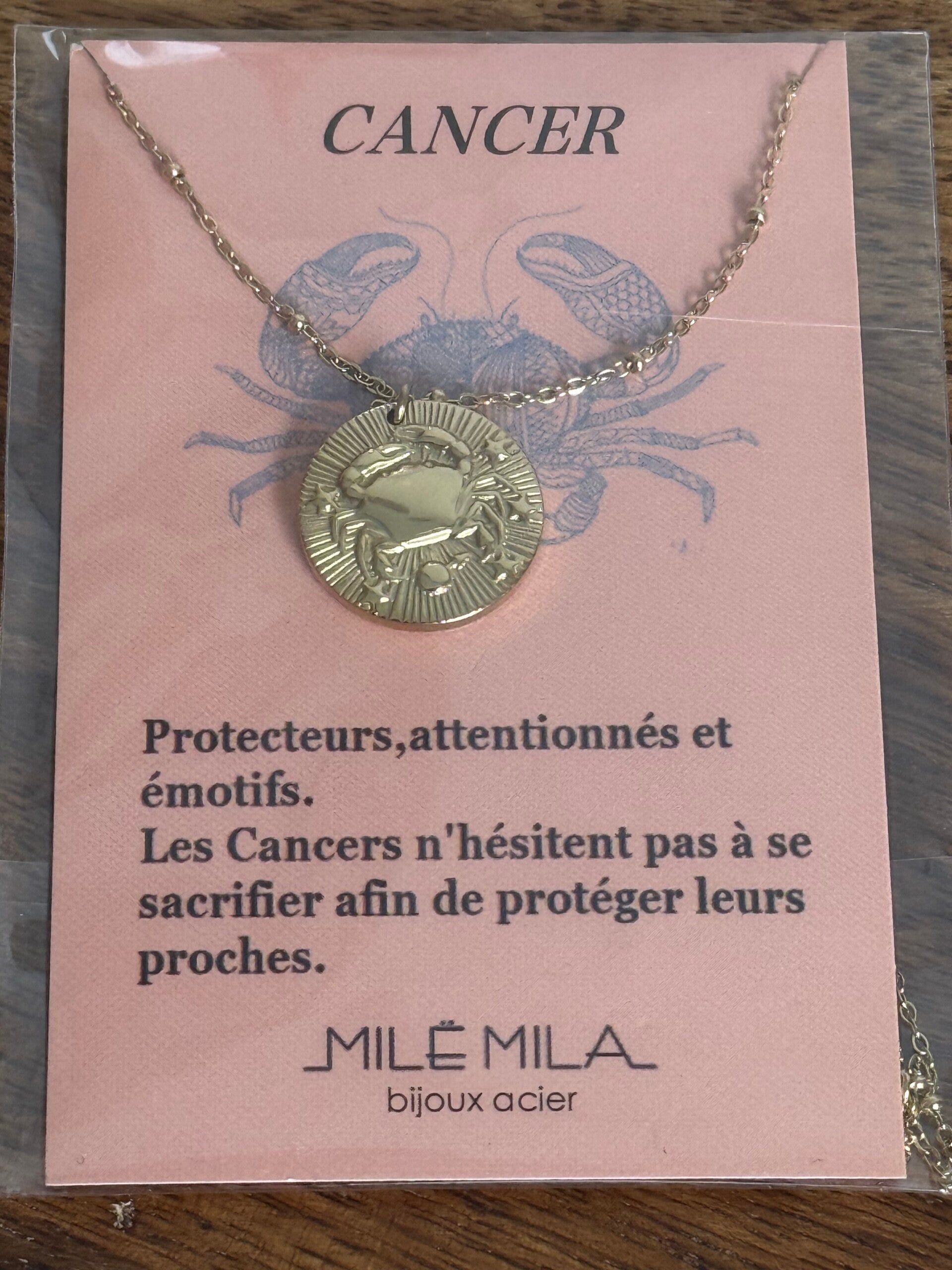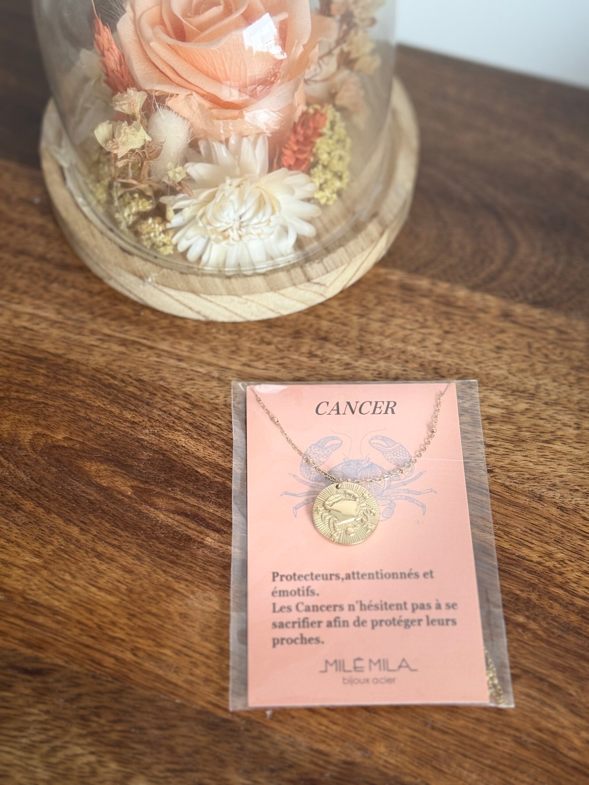 Collier astrologique Cancer – Médaille dorée en acier inoxydable gravée signe du zodiaque 🦀