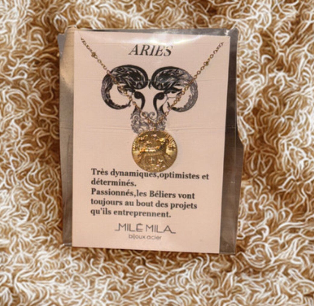 Collier astrologique Belier – Médaille dorée en acier inoxydable gravée signe du zodiaque