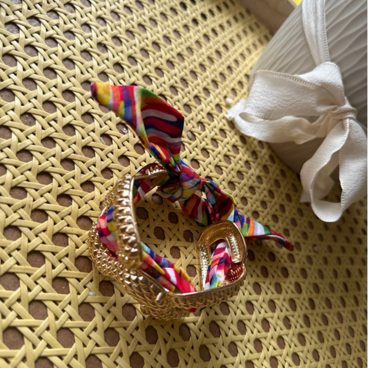 Apportez une touche d’élégance et d’originalité à votre poignet avec ce bracelet doré orné d’un foulard coloré. Son design associe une structure métallique martelée effet maille, à un ruban en tissu aux motifs vibrants et multicolores, pour un style chic et tendance.