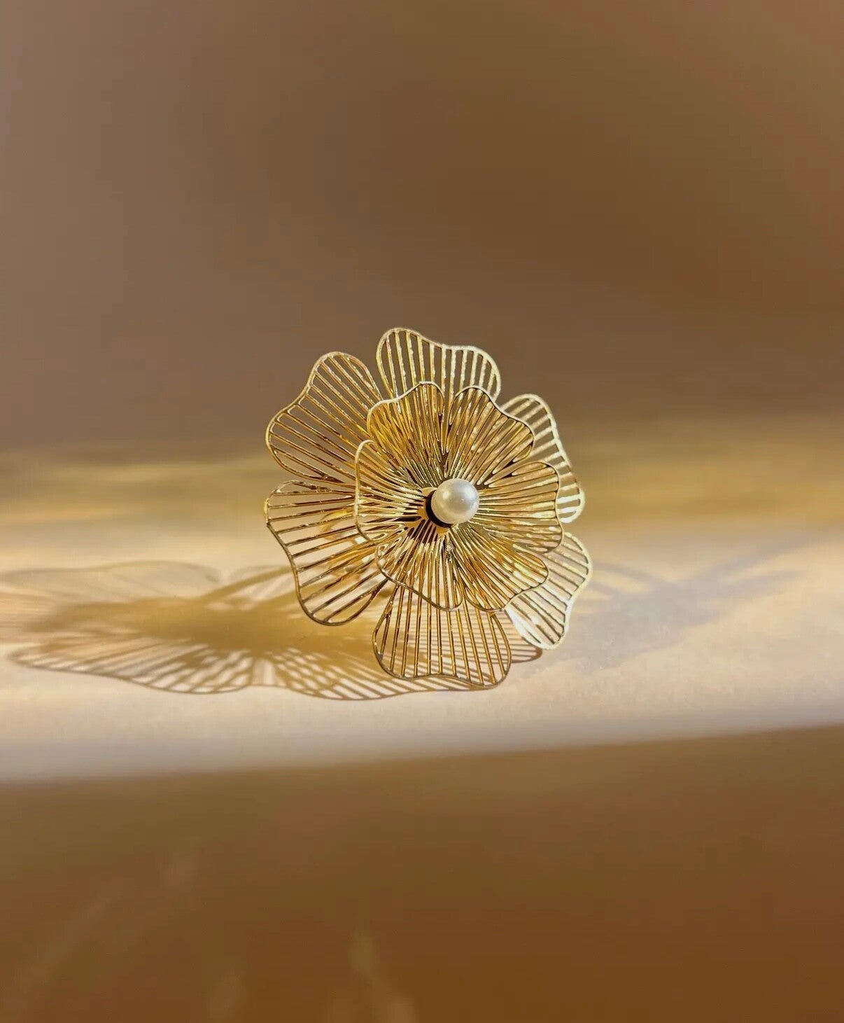 Une pièce audacieuse et élégante qui ne passe pas inaperçue. Cette grosse bague légère, dorée et travaillée en forme de fleurs, offre un style unique et raffiné. Son design métallique met en valeur chaque détail, tout en restant agréable à porter grâce à sa légèreté.