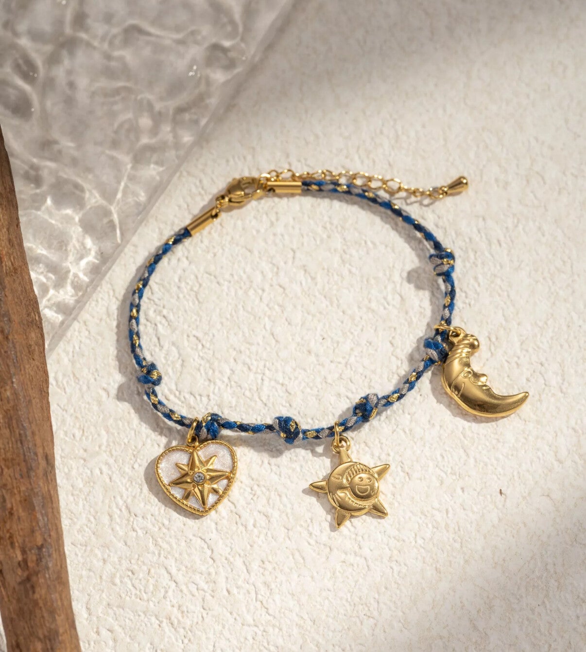 🌝Bracelet corde tressée breloques acier cœur étoile lune