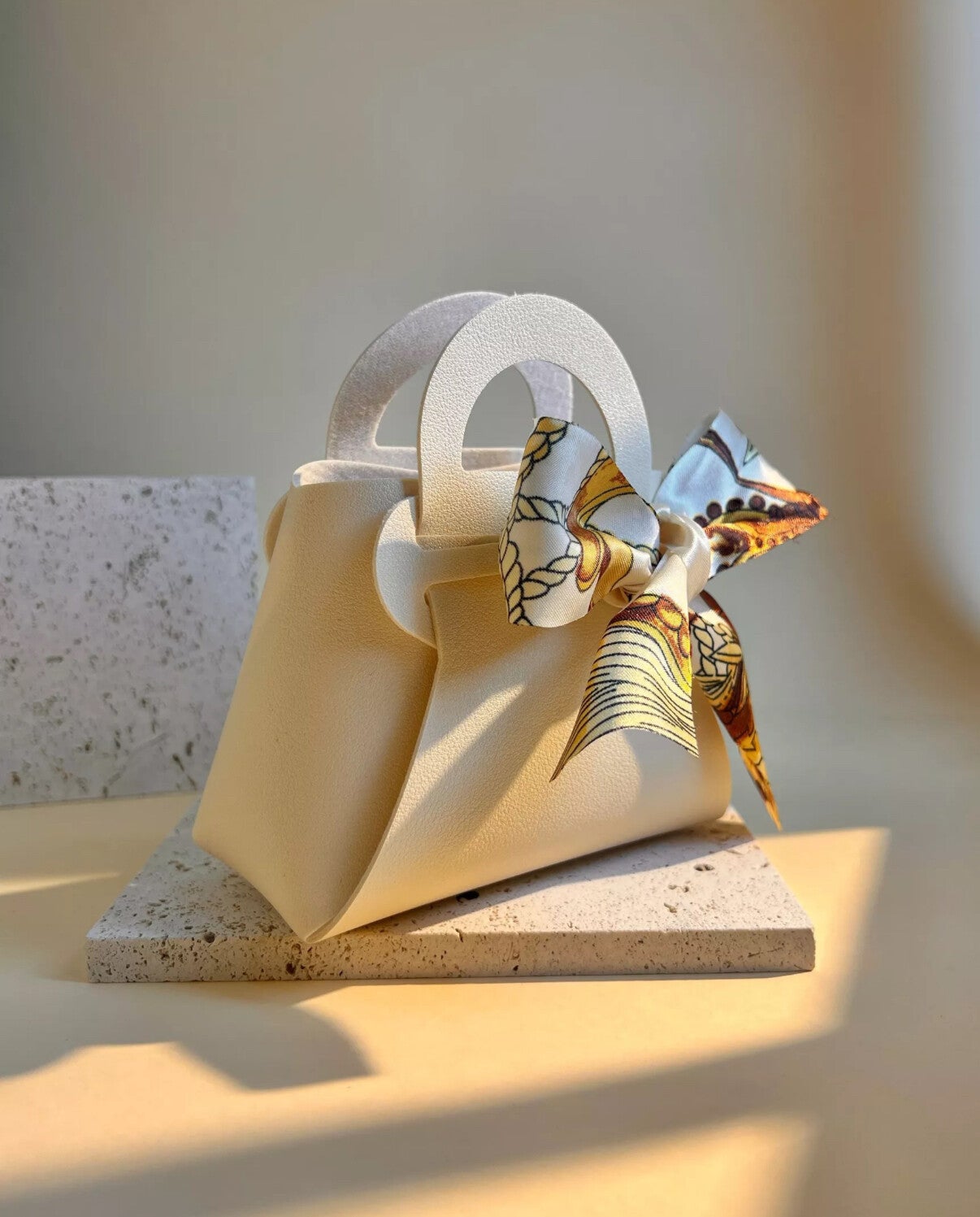 Ce mini sac cadeau rigide au design chic est orné d’un joli foulard. Idéal pour offrir bijoux, accessoires ou douceurs avec style. Réutilisable et tendance, il sublime toutes vos attentions avec charme et originalité