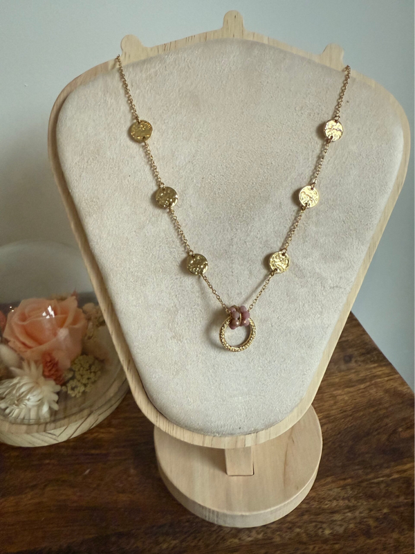 • Pendentif : rond délicatement incrusté de mini perles roses