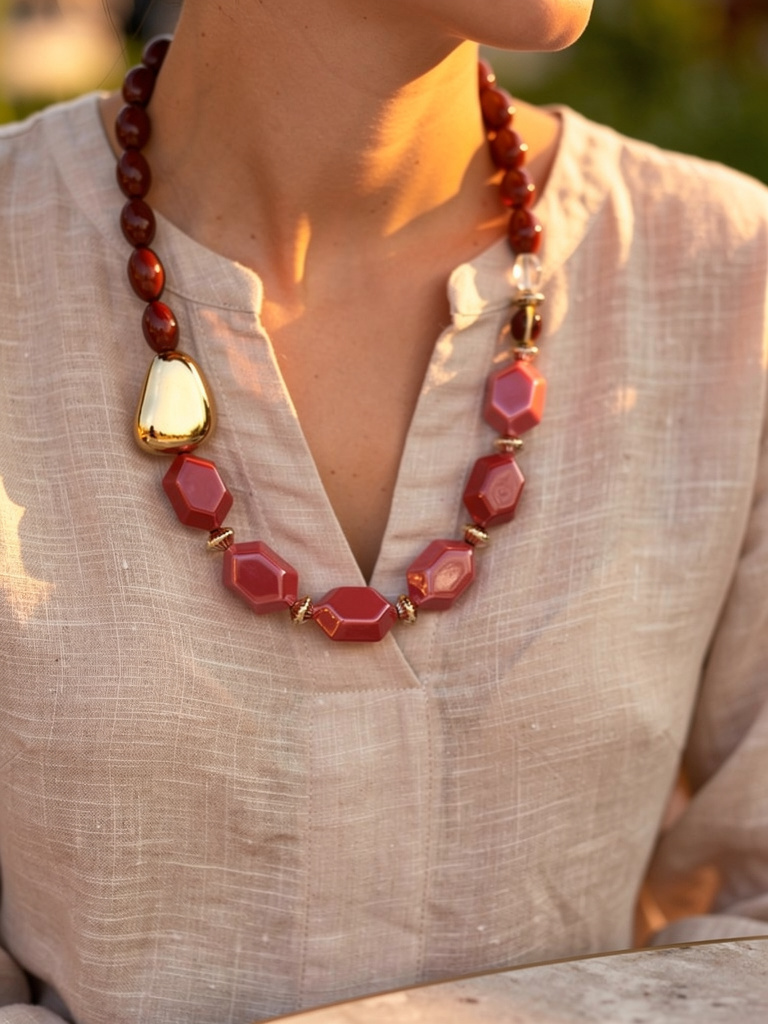 Un bijou élégant et audacieux qui attire tous les regards. Ce collier long est composé de grosses perles rouges intenses, sublimées par des touches dorées raffinées. Léger et confortable, il se porte aussi bien sur une tenue habillée que sur un look plus décontracté, apportant une touche chic et lumineuse.
