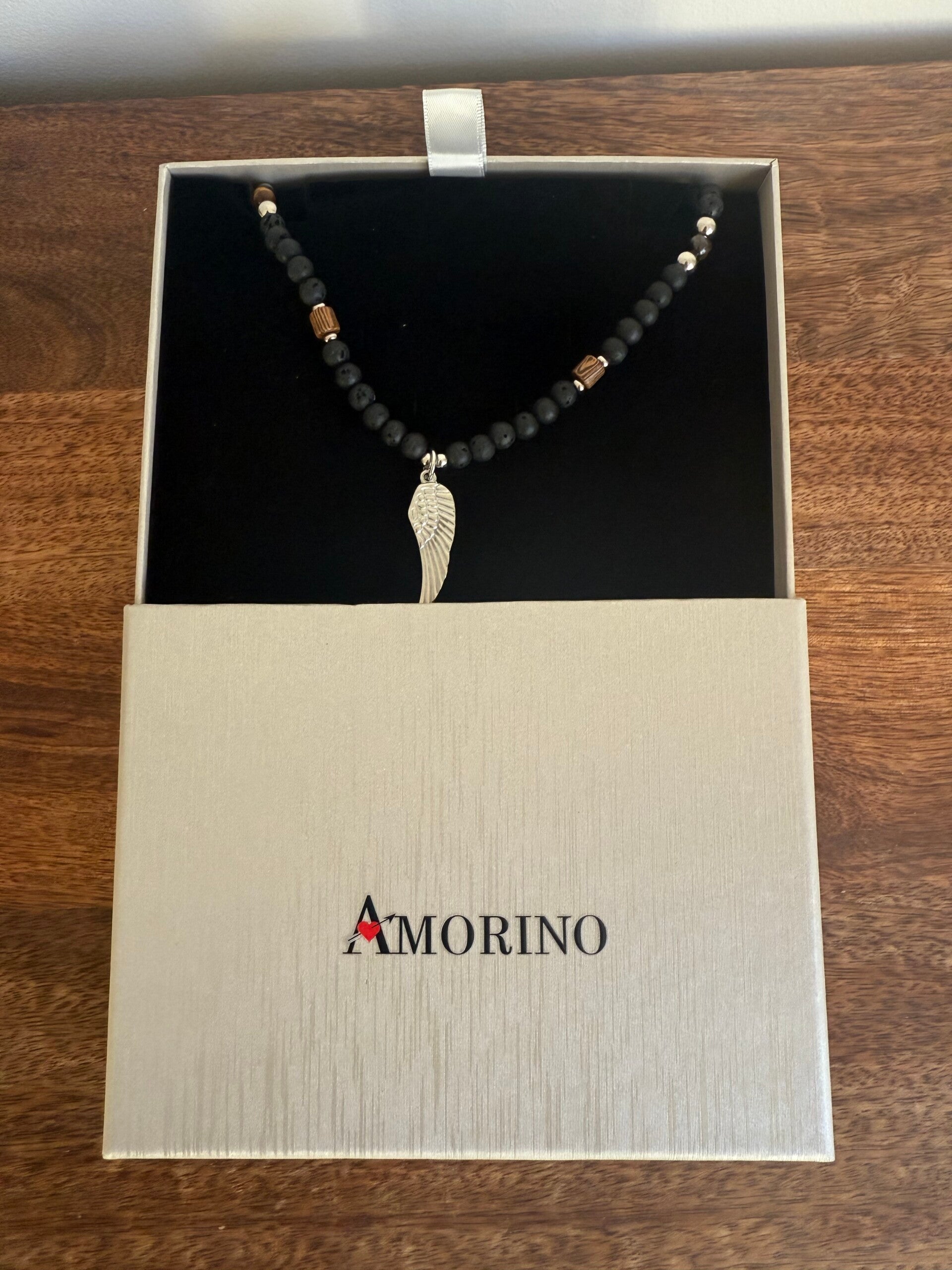 Collier pour homme, pierre volcanique & aile d’ange