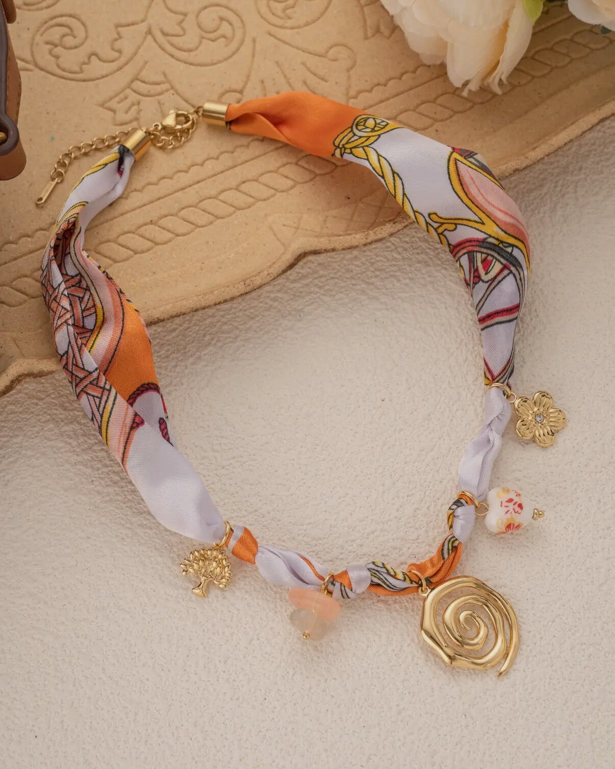 Ce collier foulard allie douceur et audace avec son tissu soyeux aux motifs vibrants et ses breloques dorées en acier inoxydable. Le pendentif spiralé et les détails floraux ajoutent une touche bohème raffinée.