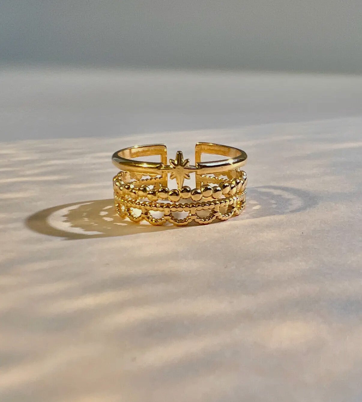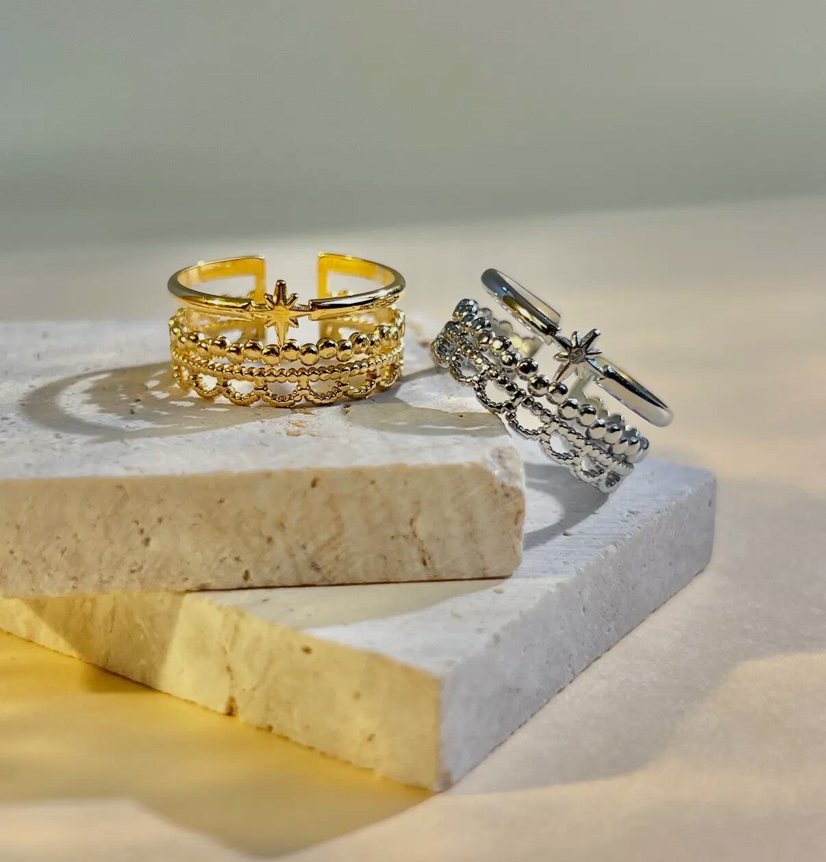 Elégante et délicate, cette bague ajourée en acier inoxydable séduit par son motif étoile central, subtilement gravé au cœur du design.