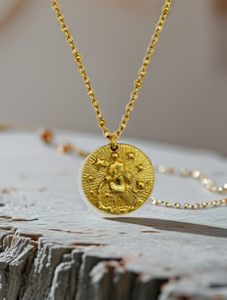 Sa chaîne fine dorée apporte une touche de lumière et d’élégance, tandis que le pendentif “Aquarius” reflète la personnalité libre, visionnaire et créative des natifs du Verseau.