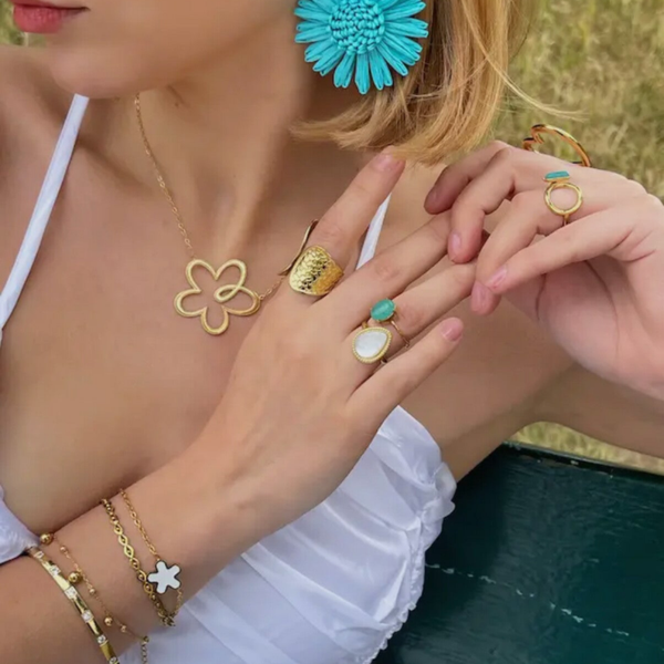 Son éclat délicat se marie parfaitement à la finesse de l’acier inoxydable doré, pour un rendu à la fois chic, intemporel et lumineux.